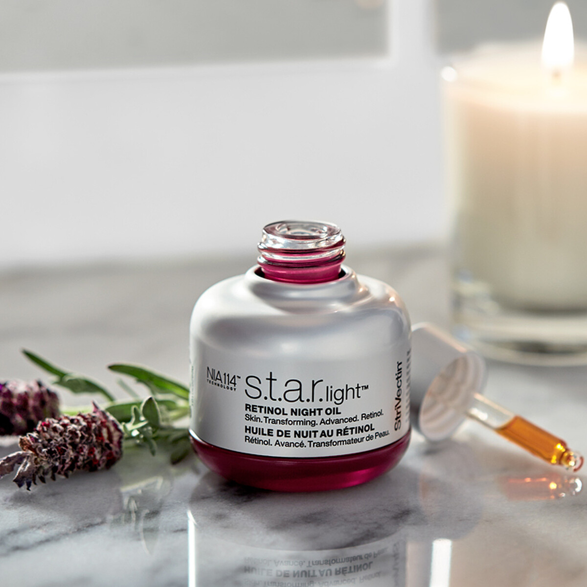 它以獨家「S.T.A.R lightTM夜煥光感美膚科技」與「專利胜肽活化科技」,結合珍貴抗老黃金A醇(煥膚、代謝斑點)、蝦紅素(減少肌膚皺紋及增加彈性)、花青素、角鯊烷油複合物™與奇亞籽油萃取,打造年齡肌膚專屬的抗老美容油,只需在睡前保養時,單獨使用或將數滴混入精華液與乳霜,搭配天然淡雅植萃香氛,放鬆心靈、增添保養愉悅並啟動夜間煥膚工程,美容覺便直接升等為抗老高質量的「美容油覺」,煥走堆積已久的黑色素、強化肌理彈性,隔天展現肌膚超閃亮!