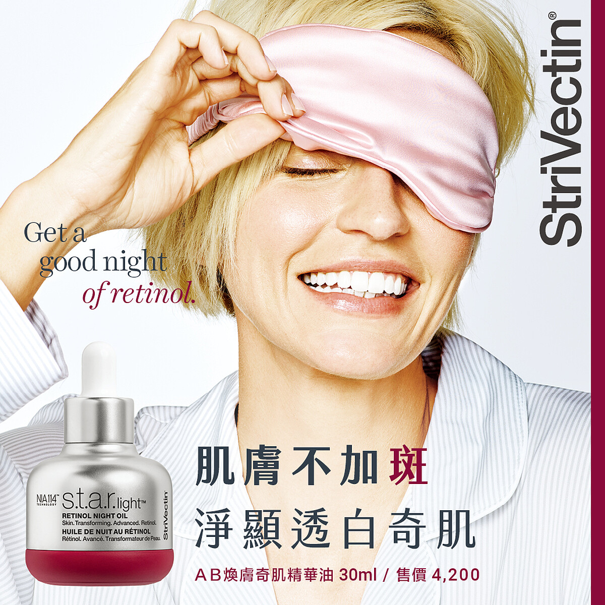 來自美國紐約的StriVectin皺效奇蹟,繼經典「抗皺」、「緊緻」系列之後,強勢推出365天適用的抗老美容油「AB煥膚奇肌精華油」。是以獨家珍貴的抗老仿生A醇*,結合抗氧明星蝦紅素、花青素等,推出淨白、抗皺多效合一煥膚美容油,煥醒白皙無瑕素顏。