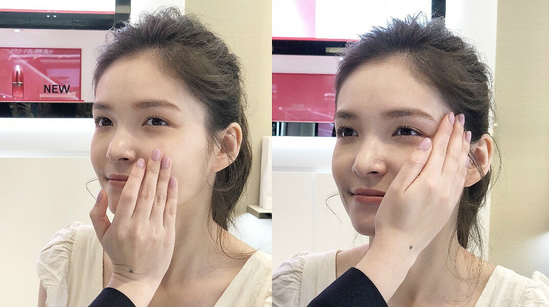 首先透過紅妍肌活露N,取適量在頰部大範圍繞三次,下顎繞三次、手掌輕貼安撫三下,這樣按摩便能將修護&防禦力發揮到極致,有效賦活健康美肌。