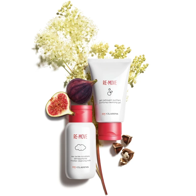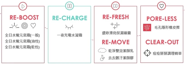 myCLARINS我的美肌配方將保養程序簡單分為淨化(Re-Move)、喚醒(Re-Fresh)、啟動(Re-Boost)、充電(Re-Charge)四步驟,以及針對Z世代最在意的痘痘與毛孔專屬配方。產品用途更直接用插圖畫在瓶身上,不看產品說明也能輕鬆快速完成保養。