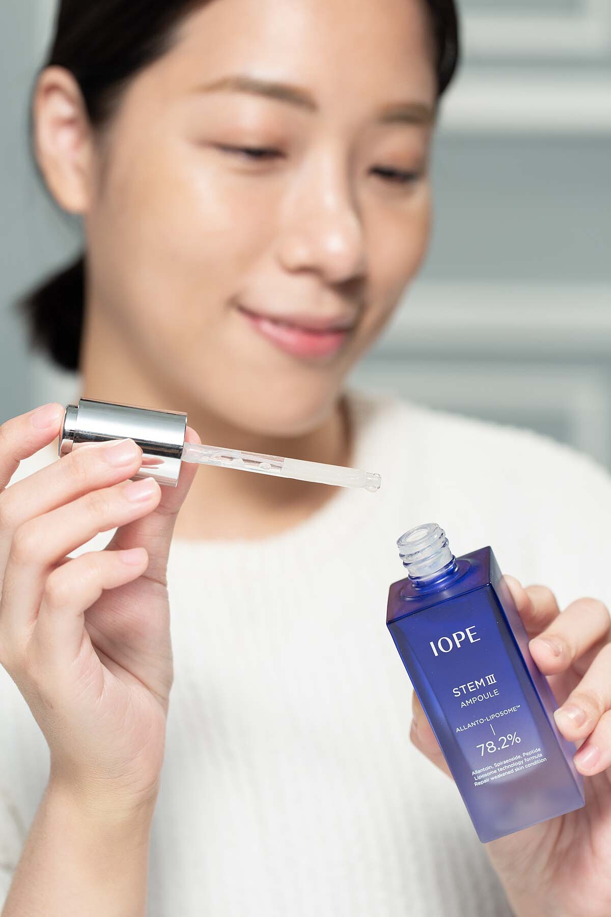 IOPE極萃新生三效安瓶精華就是一瓶超級「肌膚營養劑」,高濃縮+高效吸收,給肌膚所需能量一次完整到位!潤澤質地能有效地直達肌底,避免手心溫度影響吸收,最高效使用方式就是直接用滴管滴於臉上,神級小藍瓶轉開瓶蓋就自動吸滿一次用量,M編讚嘆小藍瓶怎麼有那麼貼心的設計啊~