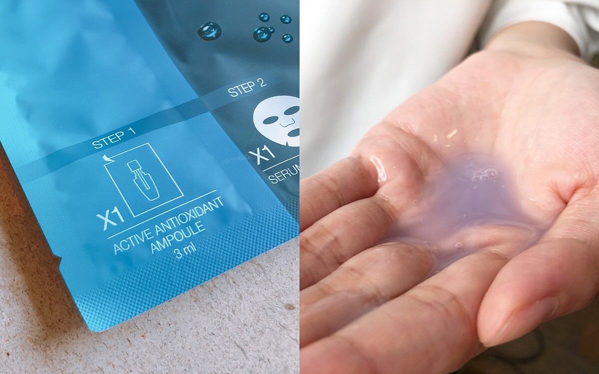 小黑安瓶配方中最厲害的就是主打修護的阿魏酸與高濃度維生素E,正是這次「超進化肌因雙效安瓶面膜」第一步驟要擦上的精華成分。在敷臉前將精華均勻塗抹於全臉,舒緩肌膚不穩定。