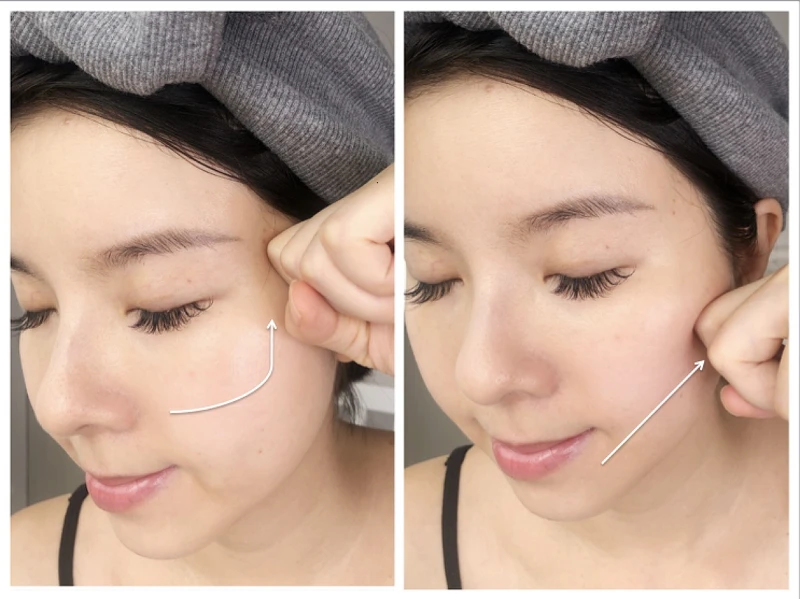 運用指節分別在蘋果肌和嘴邊肉部位,由下往上按摩,大約各按摩三下。因為精露的質地非常滑順,所以按摩時不需要太大力喔!