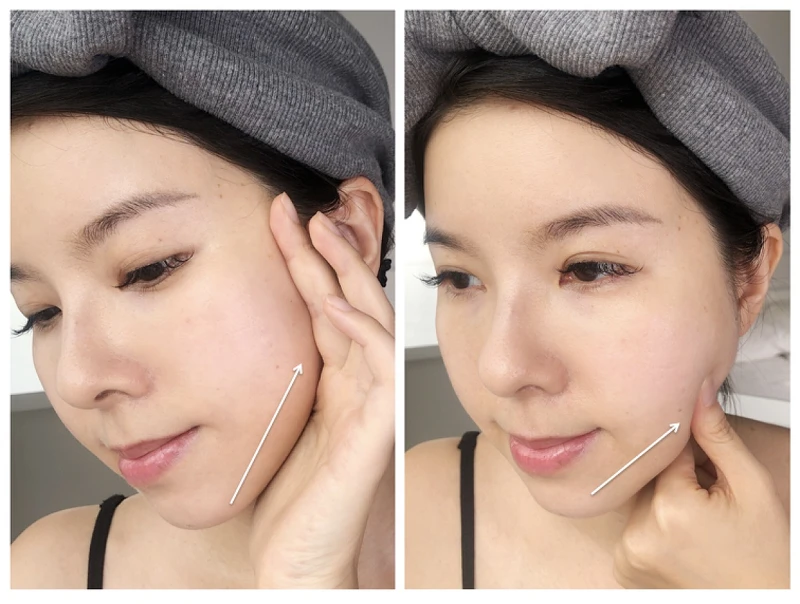 接著運用虎口往斜上方拉提輪廓線,最後再用大拇指從下巴一路按壓到耳下。精露搭配按摩手法一起使用,真的會感覺臉比較緊實。