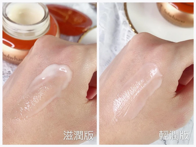 滋潤型是淡黃色的輕乳霜質地,延展性超棒,非常好推抹也好吸收,M編拿來晚上用滋潤度很夠!而輕潤型是清爽的凝霜質地,對M編的混合肌來說,白天用起來保濕力剛剛好,沒有負擔感。滋潤型有著馥郁淡雅的人蔘香氣;輕潤型則是人蔘葉與花蕾的清新香氣,兩瓶都有混合一些草本香,聞起來都很舒服,不是中藥那種濃濃人蔘味。