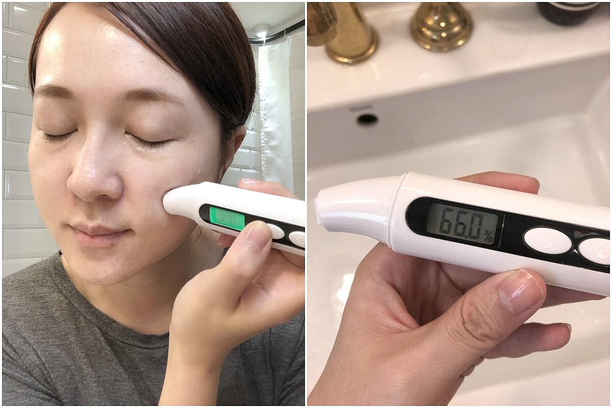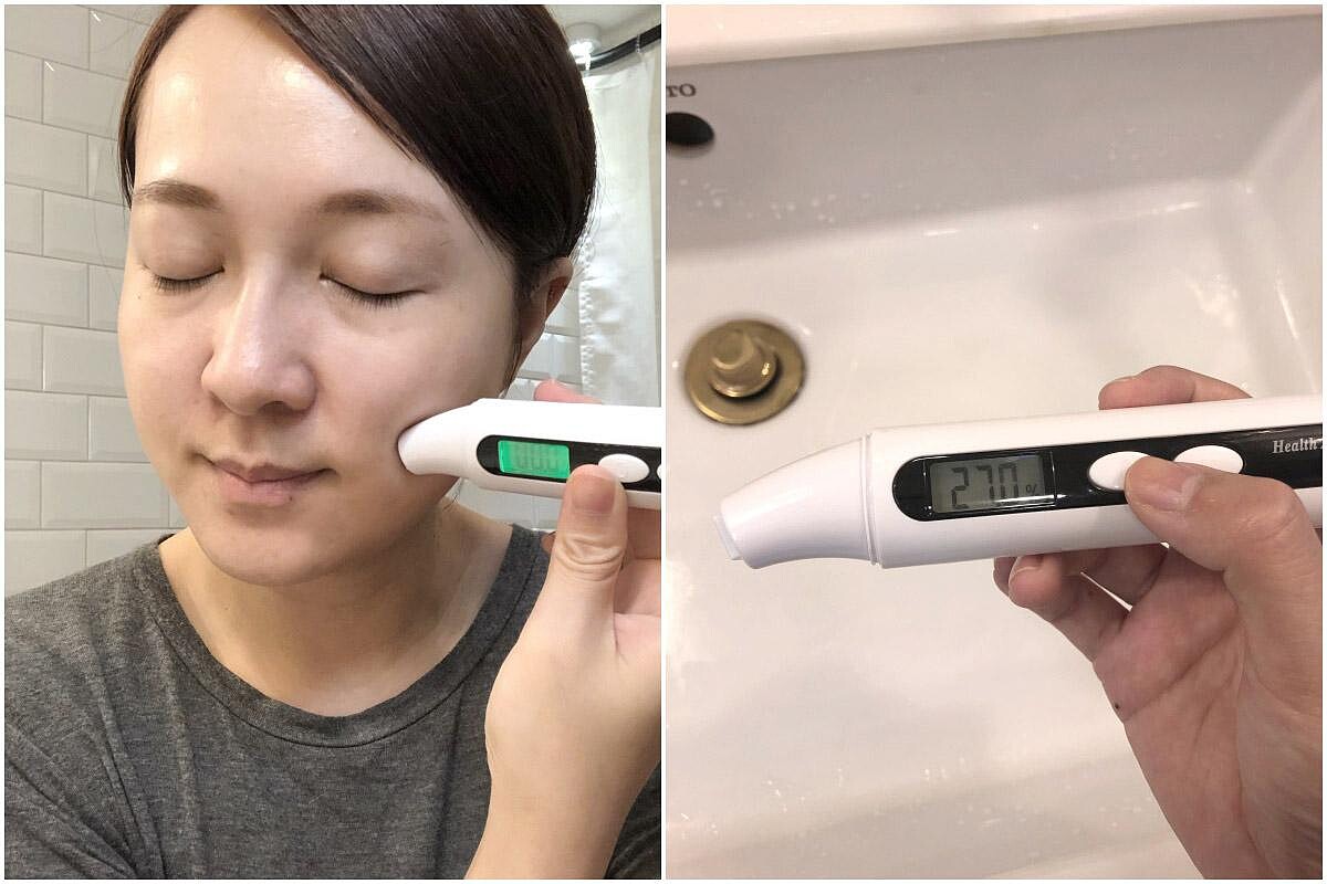 先來看看使用保濕儀器所測試的膚質狀況,隨著季節與環境的濕度會有所不同,M編的膚況使用前測試為27%,屬於正常偏乾性的膚況,一般膚質的的含水度應該會在30%-50%的範圍中。