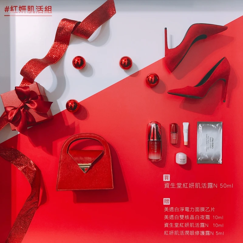 資生堂紅妍肌活露N 50ml+美透白淨電力面膜乙片+美透白雙核晶白夜霜10ml+資生堂紅妍肌活露N 10ml+紅妍肌活潤眼修護露N 5ml,價值NT5,916、特價NT3,600