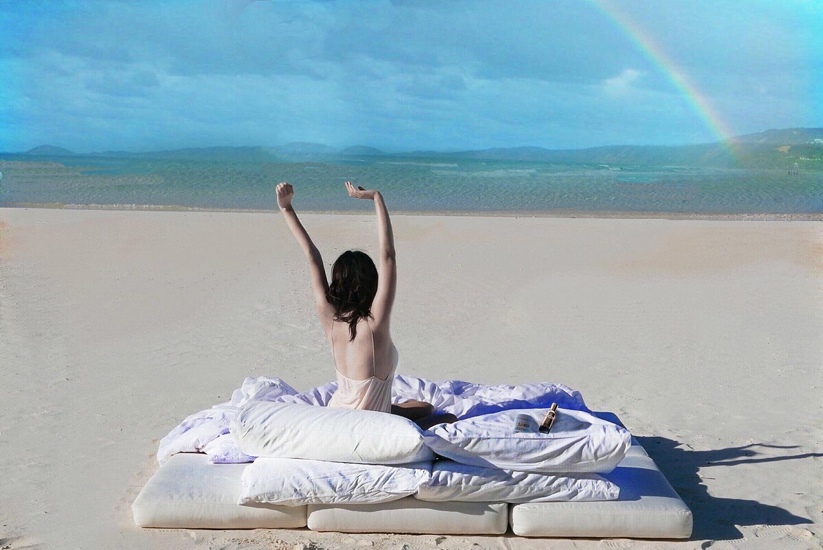 「早上在海灘上賴床突然看到遠處出現一道彩虹,感覺是真實的因為離我太近彷彿觸手可及,就像置身於某個科幻電影的場景當中,它的美卻也虛幻因為伸手才發現其實相隔萬里。在我感嘆它的無情短暫的同時,又覺得也許這也是它最大的美好,如果每日見它如見天空中的月亮,可能也就不會如此珍惜、視它為珍寶,