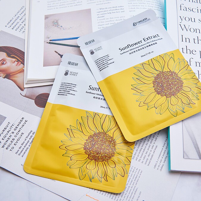 用「向日葵光透白皙生物纖維面膜」來找回透亮青春美肌。向日葵芽萃取能幫助肌膚抵禦陽光等光線造成的老化現象,加強肌膚的耐受力,還有添加熊果素,可改善肌膚暗沉斑點,讓肌膚健康白皙,看起來自然年輕有活力。