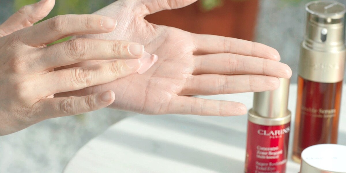 20世代的嚴正嵐透露平常的保養黃金準則:「在洗完臉以後,我會先擦上眼霜,再使用克蘭詩黃金雙激萃來穩定膚況,無負擔的水油黃金比例~吸收快又療癒,加上酌量擠壓的功能非常貼心!讓我可以依照自己肌膚的狀況來選擇用量,即刻救援乾燥爆走肌膚。