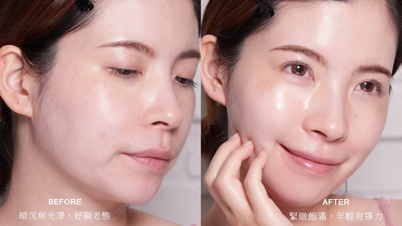 透過使用前後對比照則可看出,肌膚暗沉無光澤就會超顯老態,但認真用萃齡系列保養後,在緊緻、飽滿與彈力上的表現真的超優秀,看起來超減齡。