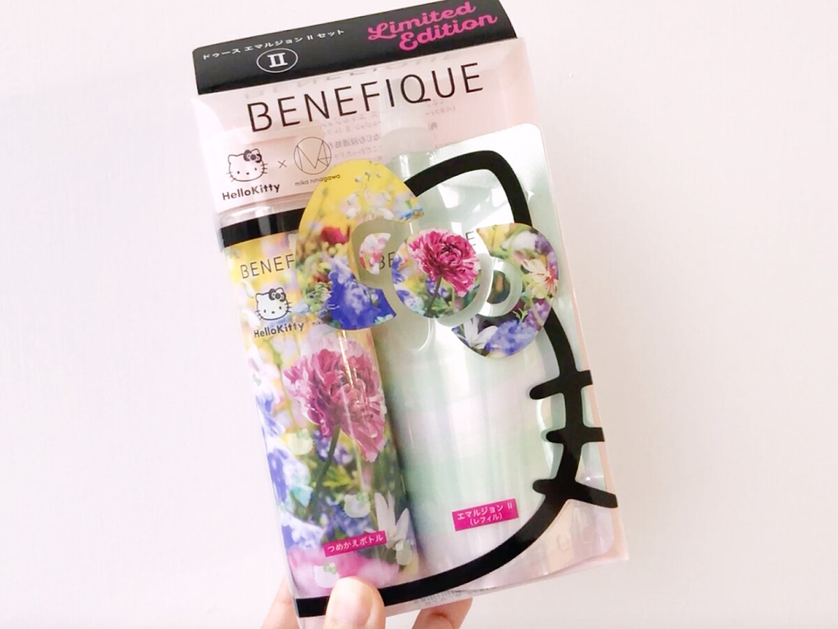 保濕水、保濕乳都是以盒裝販售,裡面有一個碧麗妃 X Hello Kitty X 蜷川実花的瓶子,同時附上保養品補充包,使用時自行填裝。