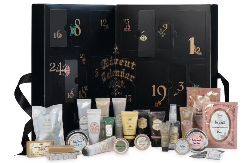 耶誕倒數月曆內含:SABON經典花香礦晶浴鹽30g、亞麻花語織物香氛噴霧50ml、以色列綠玫瑰絲綢身體乳液30ml、茉莉花語身體磨砂膏60g、SABON經典橄欖油手工皂25g、 SABON經典護手霜30ml(條裝)、賦活臉部磨砂膏15ml、以色列綠玫瑰沐浴油30ml(條裝)、死海晶礦光采煥顏三效泥面膜10ml、死海晶礦身體乳液10ml、樟木薄荷極潤護足霜15ml、玫瑰浴鹽30g、足部磨砂膏30ml、海藻防禦抗氧活膚精露1.5ml、以色列綠玫瑰身體磨砂膏60g、香蘋薰衣草沐浴油30ml、以色列綠玫瑰極潤護手霜30ml、海藻防禦淨化潔顏露15ml、蒟蒻潔顏海棉、死海礦泥橄欖油手工皂25g、海藻防禦舒敏活膚乳15ml、茉莉花語護手霜30m(條裝)、茉莉花語沐浴油30ml(條裝)、去角質絲滑煥手霜30ml (條裝) 。