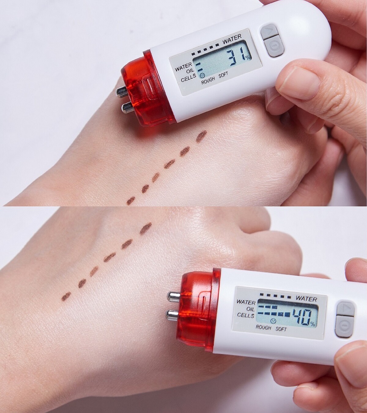 保濕力看得見、也摸得到,M編用水份儀實測:未使用的保濕度只有31%,使用後竟飆升至40%!不說還以為是在抹保養乳液呢,所以說妝前保濕要做好,飾底乳挑對、就能讓底妝沒煩惱。