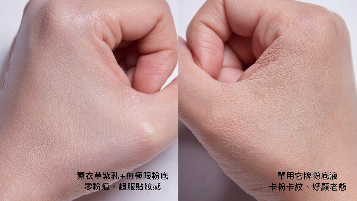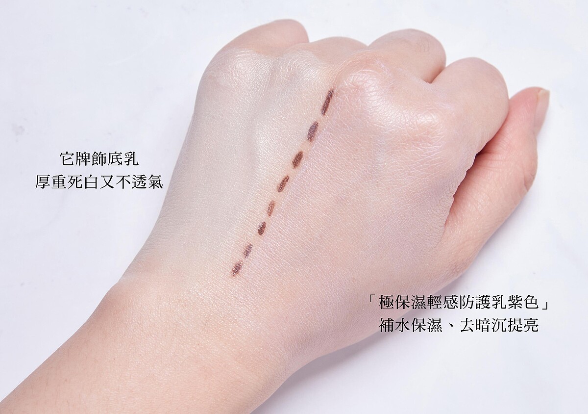 底妝前加上「極保濕輕感防護乳紫色」,滿滿水感讓底妝更均勻不卡紋,整體持妝度UP UP,超透氣又服貼、底妝感覺會呼吸,讓肌膚擁有長達24小時的水潤滑嫩與自然明亮美感。