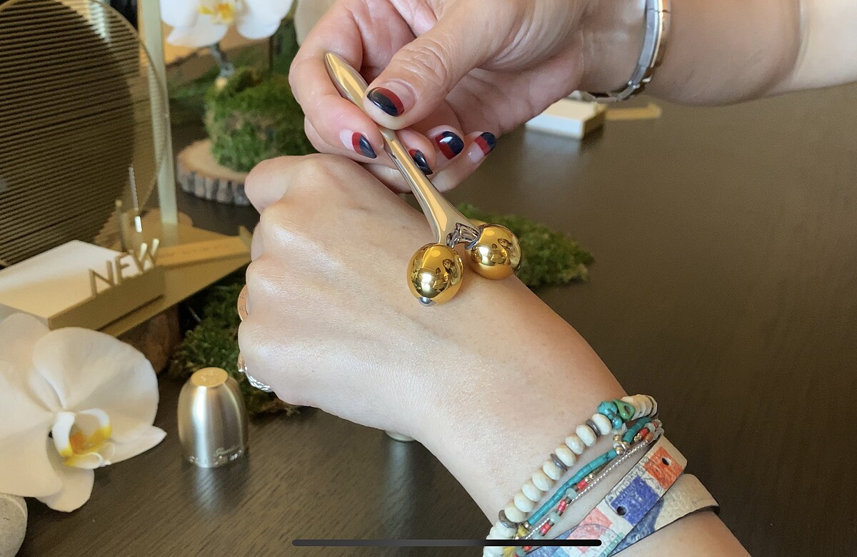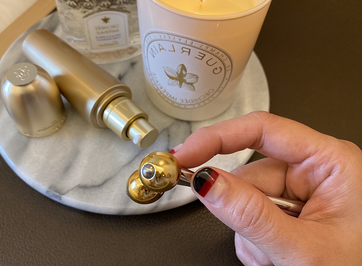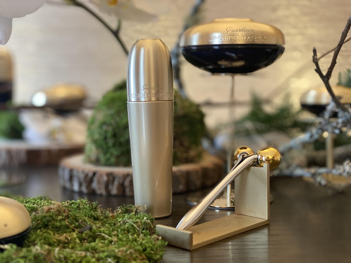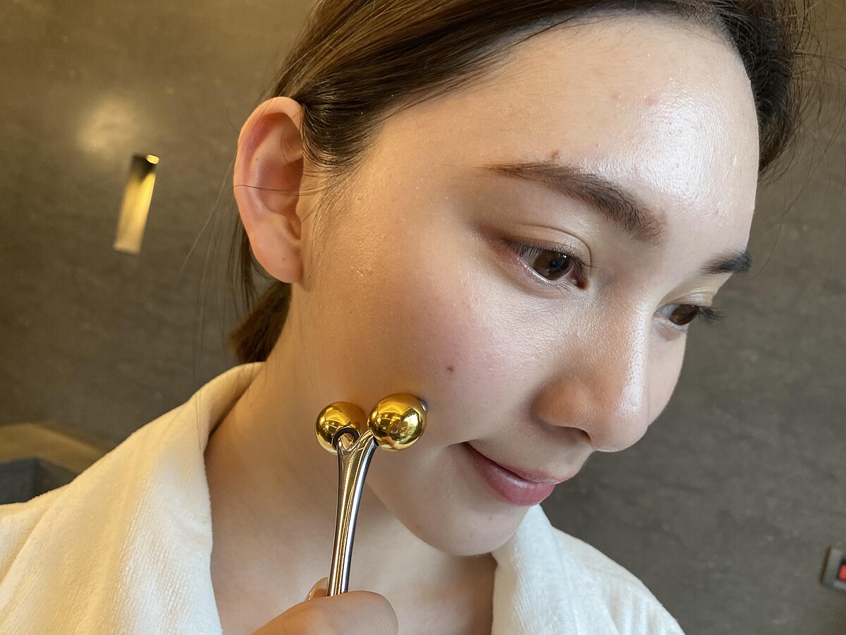 配合提升夜間肌膚緊緻的效果,搭配黃金夜間精華液還推出雙滾輪按摩棒「注氧引流超導黃金儀」,可順著淋巴系統的方向進行調理按摩。