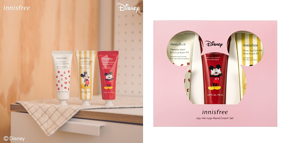外盒就有個挖空的米奇大頭,真的太可愛了!裡面是innisfree濟州護手霜組,有濟州山茶花護手霜、橄欖真萃潤澤護手霜、純淨綠茶保濕護手凝霜這3款。