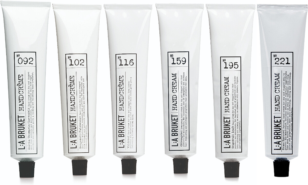 來自瑞典的保養品牌L:A BRUKET,品牌訴求從大自然中揀選天然與有機原料,重視產品不應對人體和環境有害。他們的護手霜也是十分推薦,含乳木果油、椰子油和白芒花籽油,具有高度保濕力結合不黏膩質地。共推出6款氣味、各2種尺寸,氣味分別為:葡萄柚葉、檸檬草、野玫瑰、鼠尾草/迷迭香/薰衣草、佛手柑/廣藿香、雲杉。首推經典氣味「雲杉」,木質香調相當鎮定療癒,有如來到瑞典的森林。
