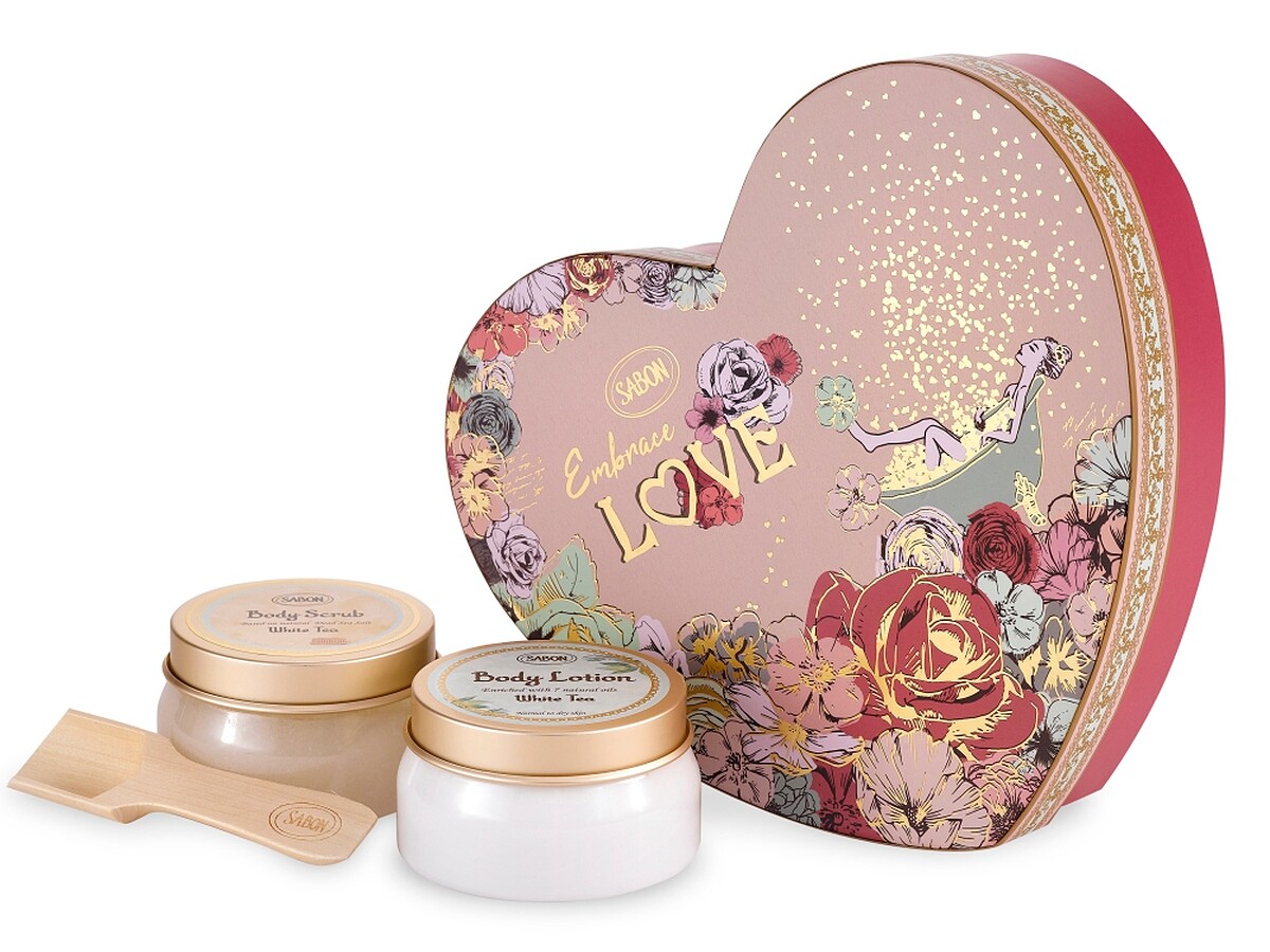 白茶身體磨砂膏200g+白茶身體乳液140ml+小木匙。經典磨砂膏與身體乳液組合,搭配限定的心形包裝,猶如滿載著對另一半的愛。