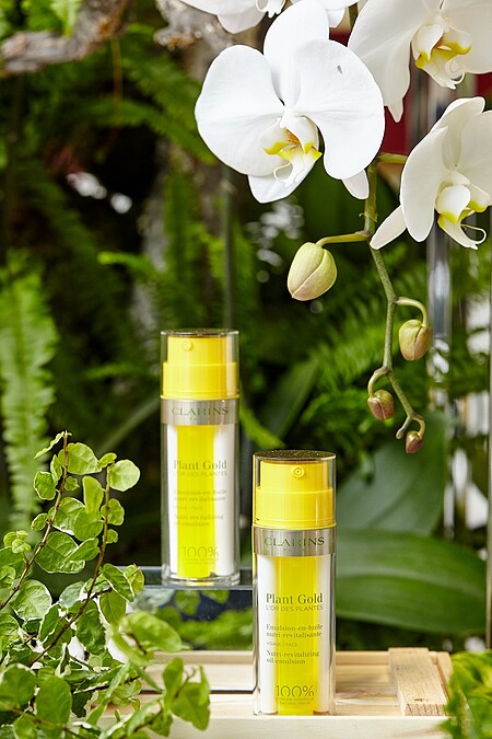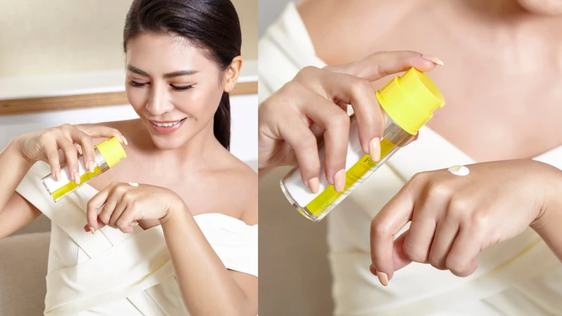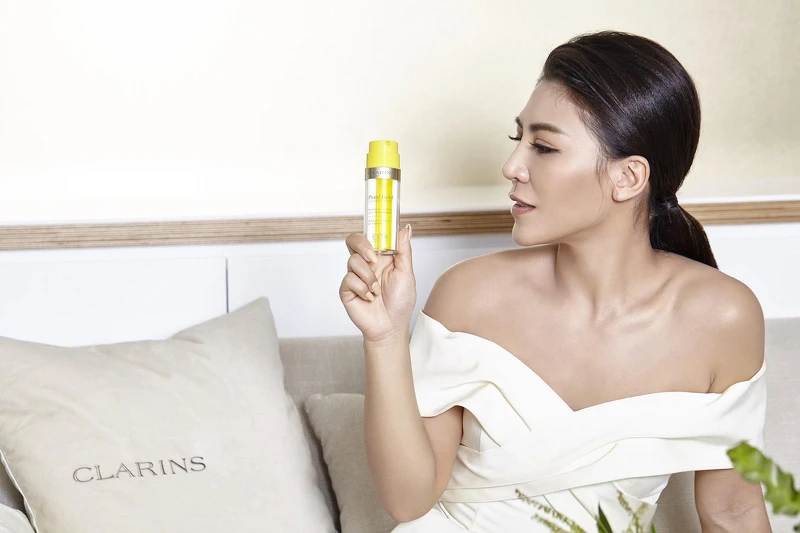 身為克蘭詩死忠粉的她,最近也用了全新雙管設計的「蘭花純萃賦活乳」。這瓶外觀超醒目的「小黃瓶」,一管是藍蘭花萃取精華結合廣藿香精油的“蘭花油”,另一管是融合葡萄籽油、甜杏仁油、夏威夷果仁油、榛果油而成的“植萃乳”,每次擠出來就是完美比例的油+乳2in1質地,化妝水後只需擦上這一瓶,肌膚需要的滋潤度與明亮感一步到位,對抗倦容提亮肌膚超有感。