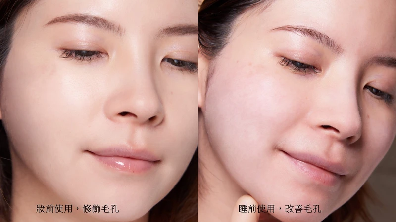 睡前使用:在保養的最後一道程序使用,薄薄塗抹在出油量大&毛孔粗大的部位,有效管理毛孔且改善出油,讓毛孔一天比一天更不明顯,肌膚摸起來光滑又細緻。