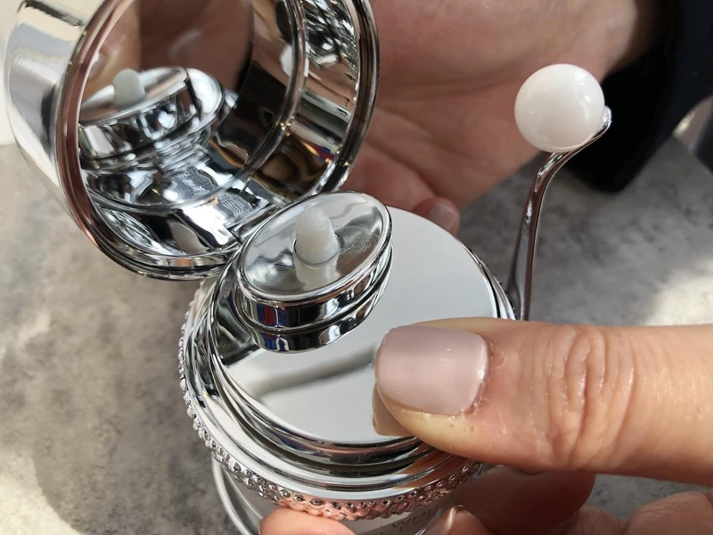 外型線條乾淨俐落,精雕細琢彷若晶瑩魚子顆粒的環形裝飾,呼應乳霜的鑽白魚子成分。至臻拋光的銀色上蓋,宛如珠寶般奢華。內面鑲崁著擁有優雅弧線的小巧照鏡,搭配線條俐落的內嵌壓鈕,輕輕一壓就擠出適量的乳霜。