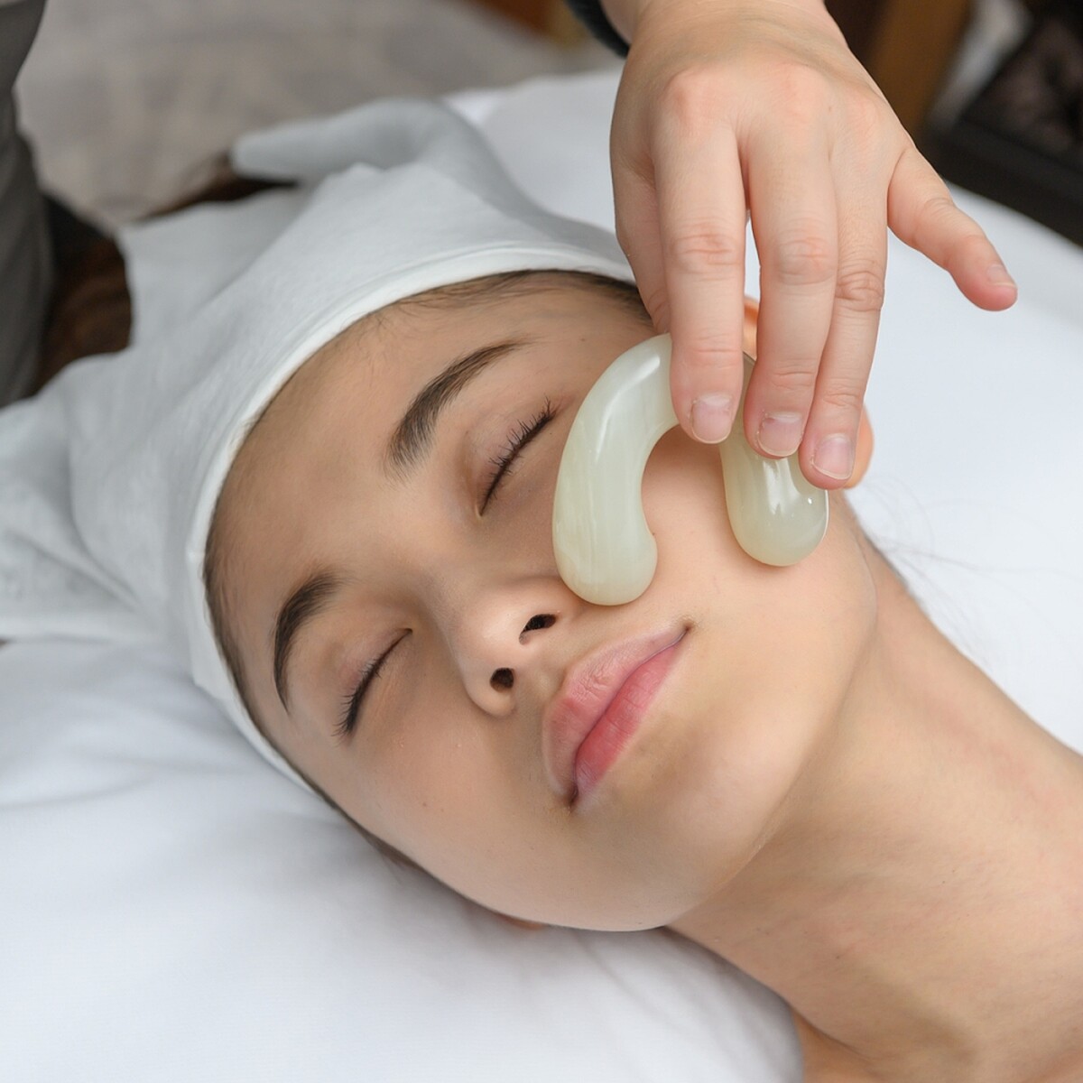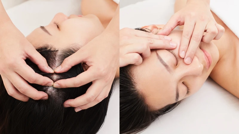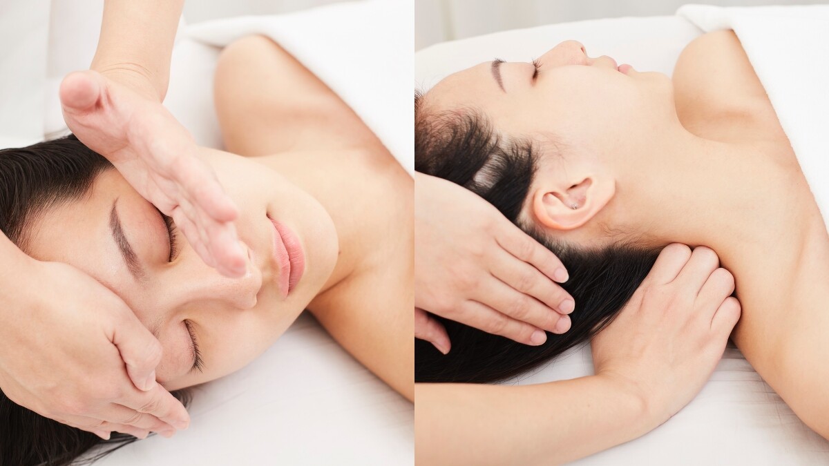 流程從放鬆頭皮開始,指尖一捏一放之間,放鬆緊繃筋膜。後續再從肩頸開始,以高頻率速度雙手帶勁刷動僵硬的斜方肌、頸部的胸鎖乳突肌。再高頻率地雕塑臉部線條、從下顎線到額頭肌肉,美療師的手柔軟中又帶著速度感,感受臉部的拉提拍彈,最後加強最困擾的眼袋處,舒緩腫脹。過程運用中、日式的骨技,手刀輕壓顴骨,讓蘋果肌更集中,並加強放鬆眼睛。在課程後,能感受雙眼更為明亮。