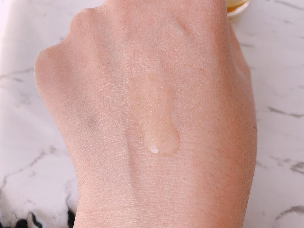 擠出來在手背上,可以看到金色的細緻礦物粉末,隨著手背輕輕挪動,金色粉末也在凝露質地中微微流動,一開始我會先按壓兩下在手背上,以右手沾取全臉均勻抹開,再擠兩到三下,奢侈的在臉上一邊滑動,一邊按彈最在意的乾燥處,很快的就可以感受到肌膚的飽滿感,光澤粉末非常細微,肌膚像珍珠一樣有著令人滿意的潤澤光透感,牛爾老師推出的最頂級系列,全方面抗老,果然沒讓人失望啊!