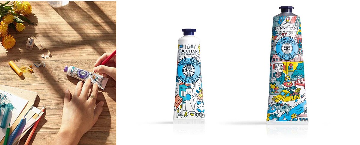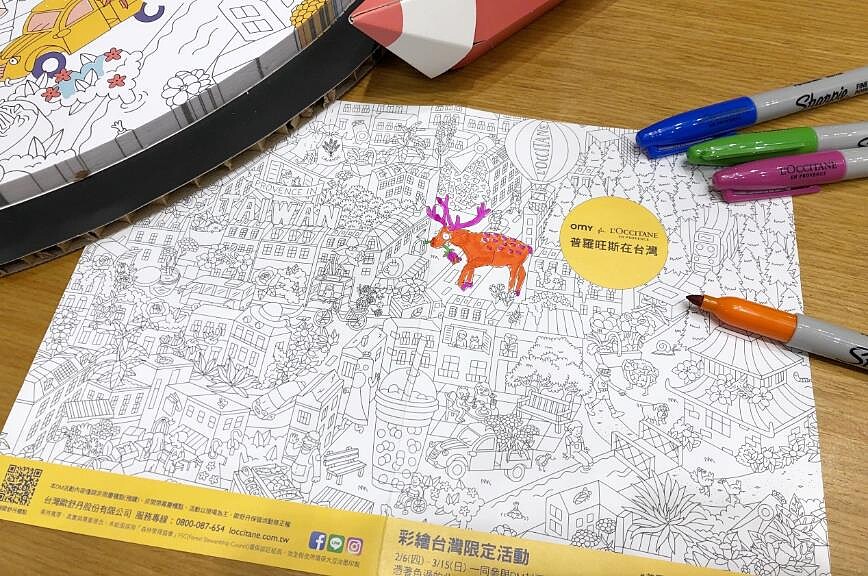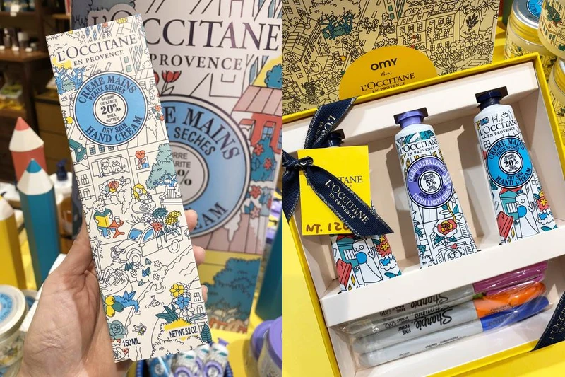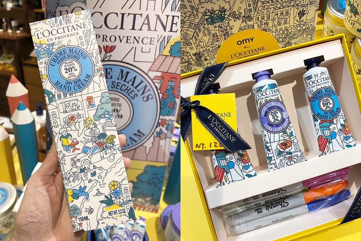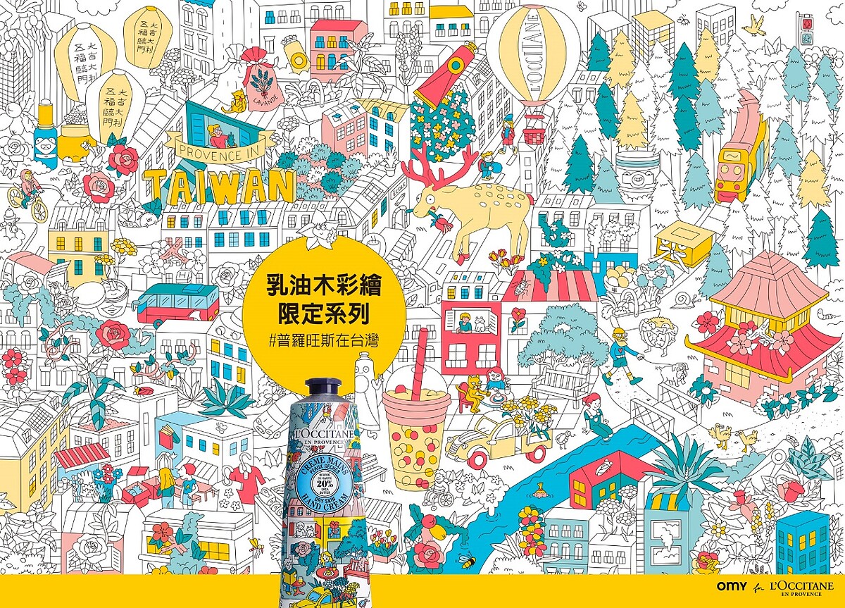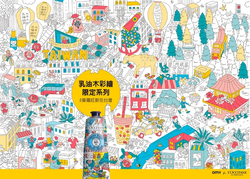 限量的彩繪包裝裏頭處處是玄機,除了可以在包裝上著色外,或許你會發現藏匿許多L'OCCITANE經典元素,像是熱氣球,腳踏車或一條護手霜等,但更貼心的是這回特別推出台灣限定創作,在全台歐舒丹店裡竟然可以發現珍珠奶茶、天燈、梅花鹿、赤崁樓、小火車等插畫藏在各個角落,快到櫃上拍照留念吧!