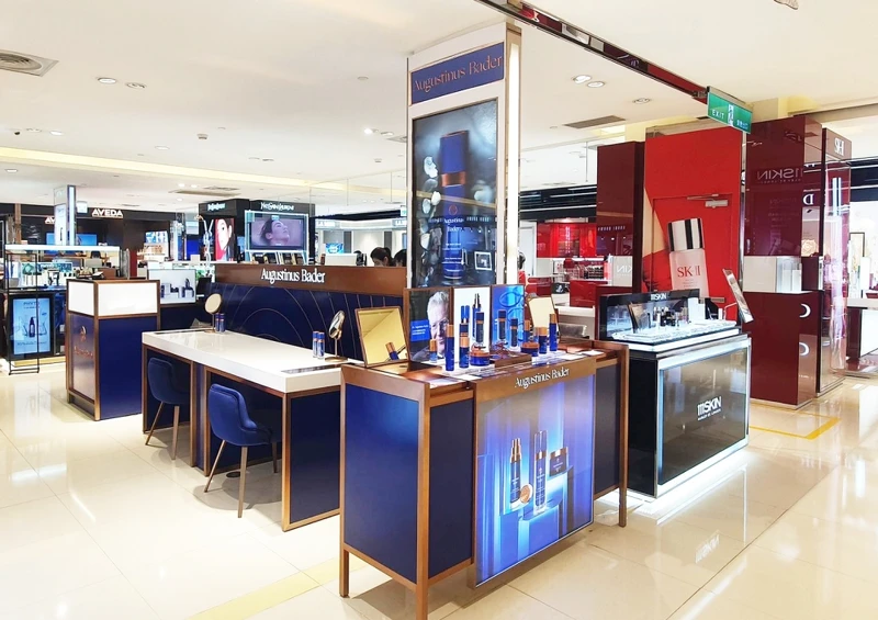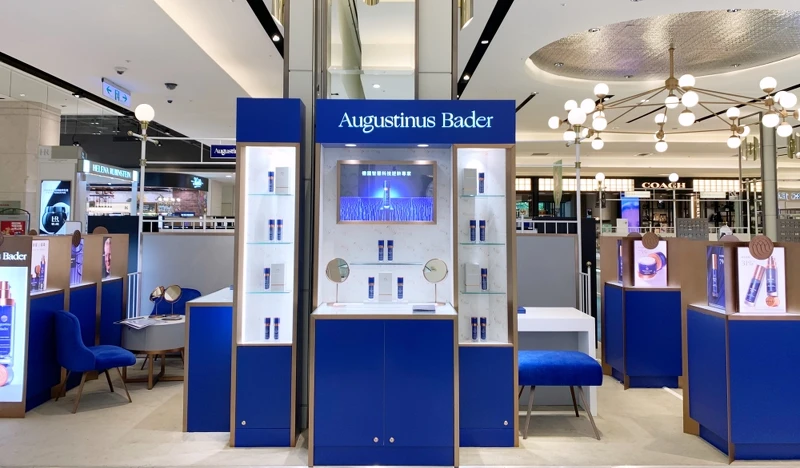 Augustinus Bader的包裝以經典藍搭配古銅金,質感極佳。目前德國AB在台灣的第一個專櫃於2020年3月25日在新光三越台北信義A8館一樓開幕。
