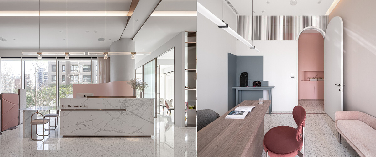 陳怡蓉一直相當喜愛紐約曼哈頓的挑高建築風格,因此在第一眼見到紐約白派建築大師-Richard Meier參與建造的這棟建築時立即傾心,因為這跟她與老公想打造的放鬆醫美氛圍非常符合,於是她親身參與所有設計,從空間配色、配置、裝飾、甚至綠植通通用心規劃。
