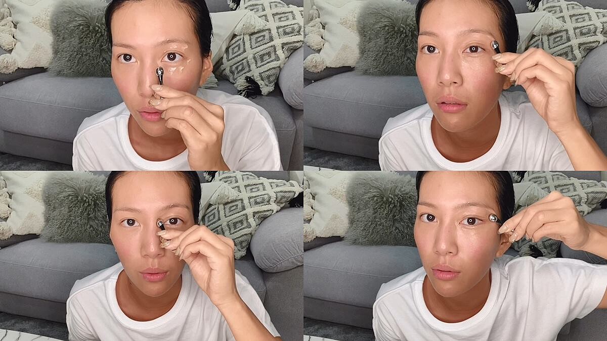 莫莉提醒大家擦眼霜要積極,每次的量不需要太多,免得長肉芽,搭配海洋拉娜「銀製眼霜導入棒」效果更好,按摩方式很簡單,先在黑眼圈處來回滑動促進循環,接著從上眼周畫大圈到下眼周,讓眼周肌膚徹底吸收高濃縮精華,並加強眼頭眼窩處舒緩疲倦,最後從下眼頭往太陽穴的方向拉提,瞬間就喚回明亮有神的雙眼!