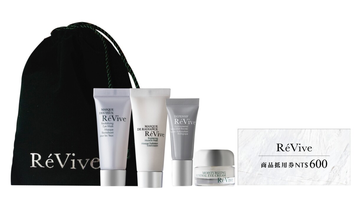 只要線上預約護膚(預約網址:https://revive.com.tw/202005-event),護膚當日即贈全效複合抗氧精華3ml+金緻導入嫩白面膜7ml+光采再生賦活眼霜3ml+賦活晚安眼膜5ml 、並享NT600折扣(價值NT5,000)!