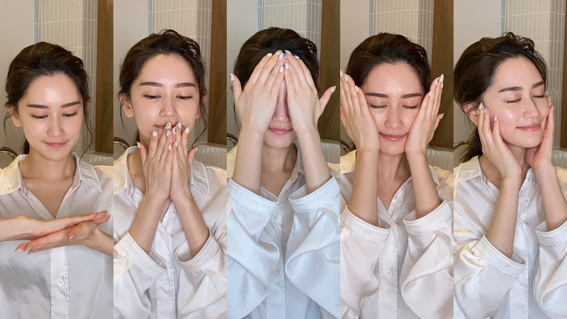 Step3.掌心於兩頰由下巴至太陽穴,做出壓彈的動作,增進肌膚彈力,使肌膚澎潤透亮