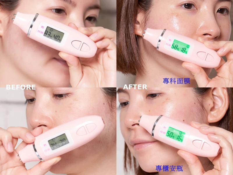使用前先分別測試兩邊的數值,接著左臉使用專櫃安瓶,右臉則敷上專科面膜,15分鐘後來測試保濕力。