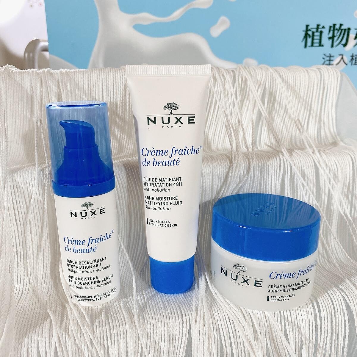 NUXE植物奶防護系列添加獨家配方「植物奶」、海洋精華以及獨特花卉成分,清爽保濕好吸收,NUXE嚴選7種植物成分:金合歡、豌豆、綠茶、杏仁、燕麥、椰子、及大豆,利用植物親水及親油特性結合而成的植物蛋白;以專利環保萃取法,提取波羅的海紅藻中的海洋多醣濃縮精華,提供保濕及防護雙重功效;獨特花卉複合成分來自杏花和橙花,有助於舒緩和柔膚,任何肌膚皆適用,清爽補水不黏膩,男性肌膚也適用。