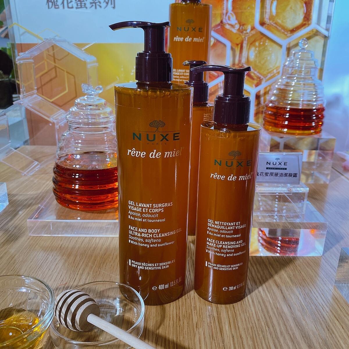 NUXE槐花蜜系列採用上等蜂蜜「槐花蜜」及多重植物精萃油,葵花籽油,能補充優質脂質,強健肌膚表層,同時增加潤澤度;大麥、刺阿幹樹、及乳油木果,舒緩、柔軟肌膚,為肌膚帶來修護力。