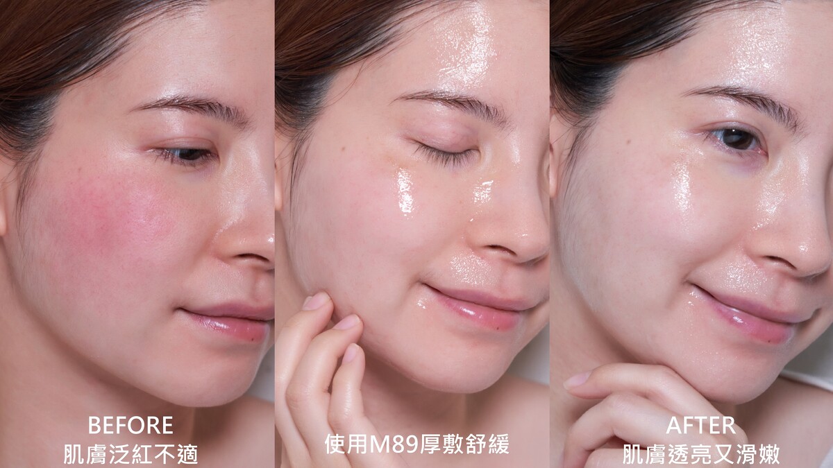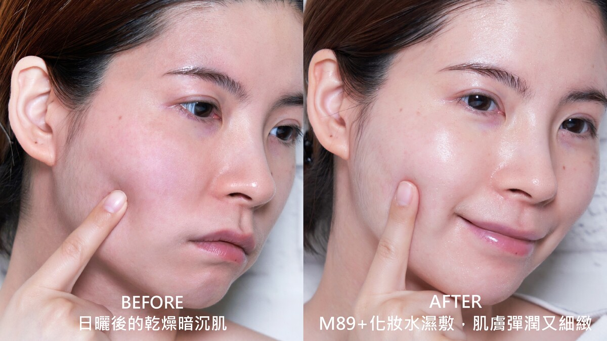 *曬後立即修護:夏天就是要出遊,但長時間戶外運動、海上活動,強烈的紫外線、海水讓皮膚乾燥泛紅、敏感不適,甚至皮膚暗沉?用M89搭配化妝水濕敷,只要5分鐘,讓暗沉乾燥肌立馬水嫩,連膚質都變細緻,肌膚飽滿回彈力十足。