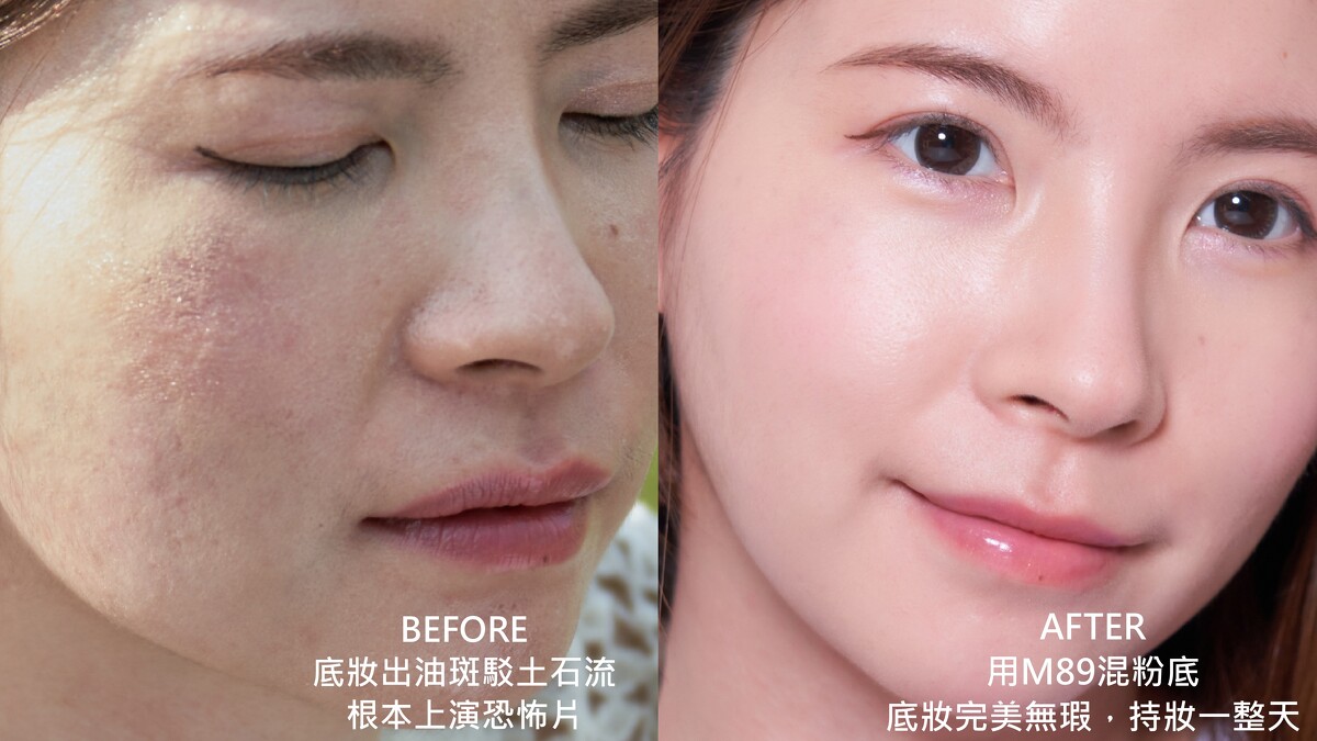 *幫助底妝持久不脫妝:高溫的天氣讓底妝容易臉出油導致脫妝斑駁,根本上演恐怖片@@妝前用M89保濕精華液混粉底液,不僅讓妝容更服貼,還能幫助持妝長達8小時,彷彿剛上妝般完美無瑕。