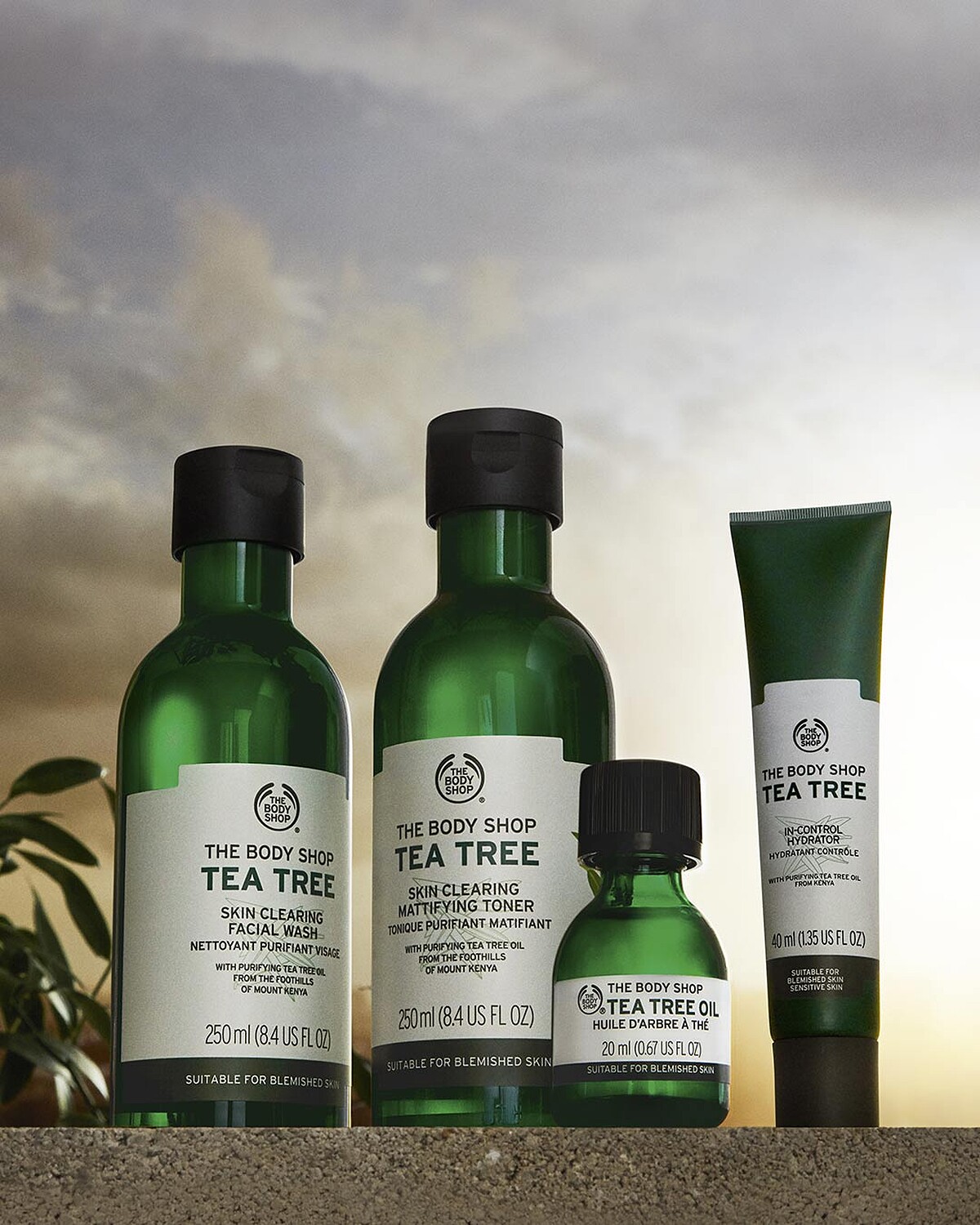 THE BODY SHOP的天然茶樹成分來自非洲肯亞,茶樹葉子於採收後的12小時內快速蒸餾,保存其最新鮮的活性,能溫和且快速深層淨化毛孔,抑制分泌過盛的油脂,舒緩正在發生或即將發生的肌膚問題。配方加入檸檬茶樹精油,所以很多人會覺得THE BODY SHOP的茶樹系列聞起來很舒爽,不刺鼻,清新的香味甚至可以提振夏日昏昏欲睡的疲憊,趕走夏日煩躁感,根本是肌膚到身心靈都徹底被淨化了!