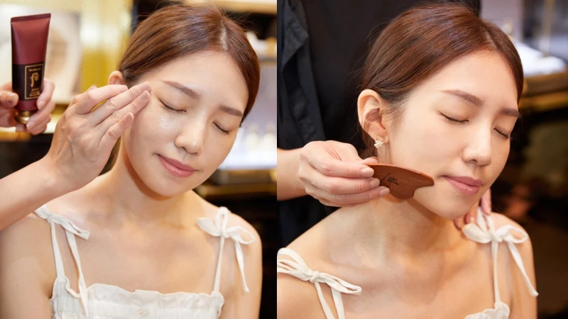 進行重頭戲減壓舒活按摩時,一開始就用上Whoo后的超級明星產品----配方升級、結合82種極優韓方原料與全新拱辰精萃培養液的「秘帖循環精華」來喚醒肌膚,使皮膚吸收力有如火力全開,加速對後續保養品的吸收。接下來,敷上以多種韓式美顏秘方及紅山蔘製成的無油精華面膜「津率享紅山蔘清氣面膜」,並搭配觸感好舒服的棗木刮痧按摩片來活絡提亮臉部肌膚,Clio感動的說:「非常舒服啊!」