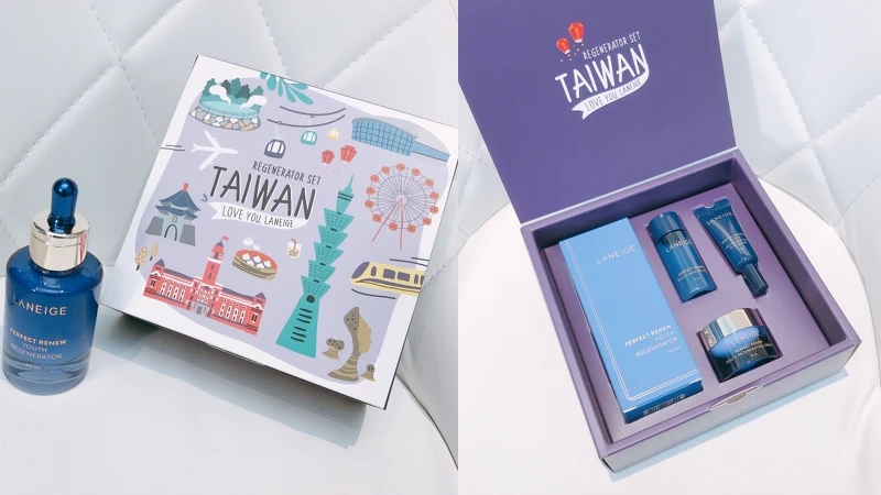 LANEIGE蘭芝針對初老問題特別設計的完美新生系列,2020年9月隆重推出升級版,從預防皺紋、強化緊緻度、肌膚紋理、光澤感和保濕力等五大關鍵下手,找回細、嫩、緊、亮、彈的年輕肌膚。其中明星經典產品就是有「修護小電瓶」之稱的完美新生肌能露AD,高效滲透力能為肌膚快速充電。週年慶更特別推出藍色小電瓶經典禮盒,包裝還是特別為台灣設計,上頭有著101大樓、野柳女王頭的圖案,非常亮眼。