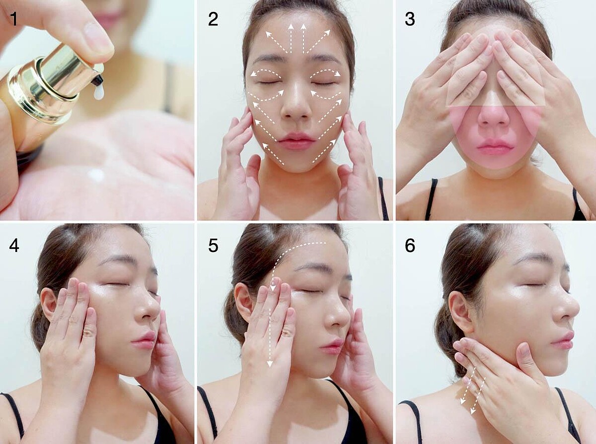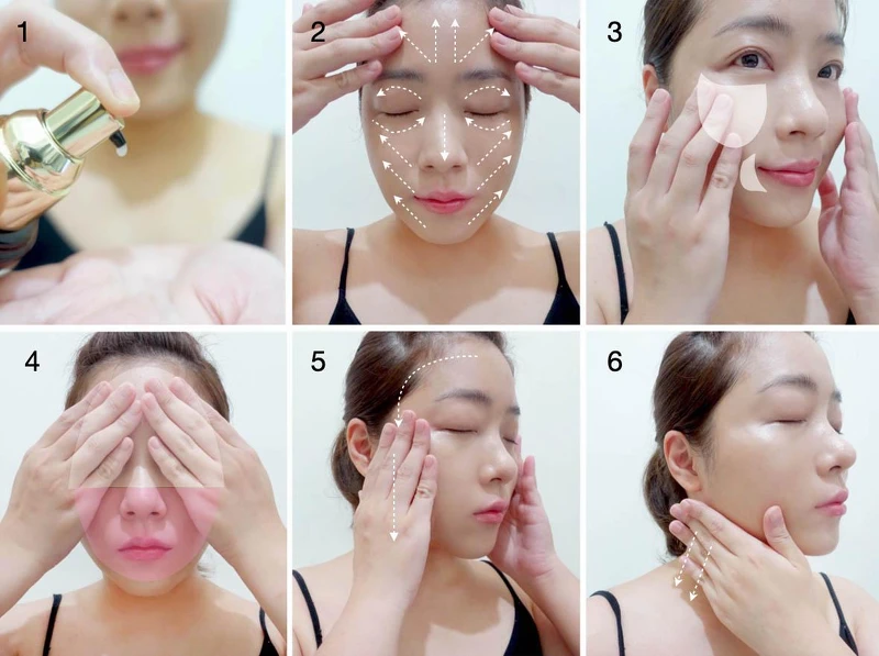 1按壓2~3下精華液於手掌心。2從臉部中央往外側塗抹全臉。3全臉分為上下兩部分,用手心包覆按壓。4按壓太陽穴,穩定彈力感。5從額頭髮際線往鎖骨方向輕撫。6最後往下塗抹整個頸部,往鎖骨輕輕按摩。