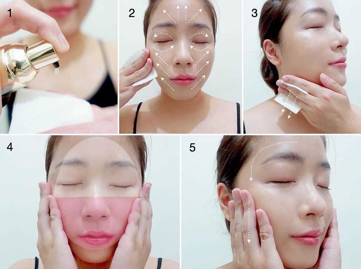 1按壓2下水凝露於化妝棉。2從臉部中央往外側輕滑、塗抹全臉。3接著塗抹整個頸部。4全臉分為上下兩部分,用手掌包覆按壓。5從額頭髮際線往鎖骨方向輕撫。