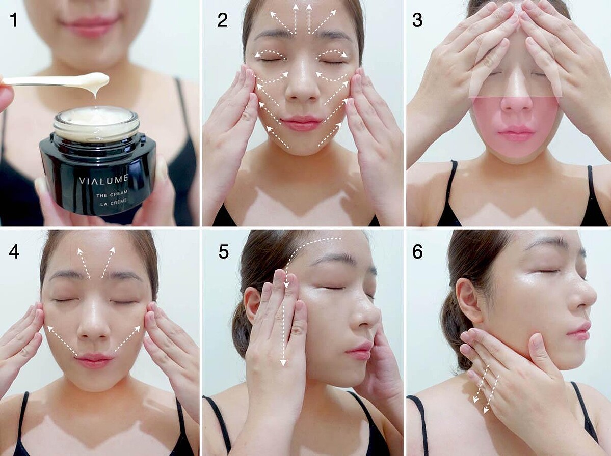 1用挖棒取約2顆珍珠大小的乳霜於手部。2從臉部中央往外側塗抹全臉。3全臉分為上下兩部分,用手掌包覆按壓。4手掌分別在臉的上下半部,從中央往外輕撫。5從額頭髮際線往鎖骨方向輕撫。 6最後往下塗抹整個頸部。