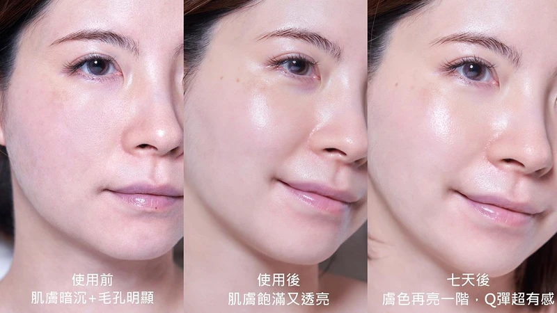明亮度也是差很大~兩天一次的面膜三步驟,一週透亮超有感,肌膚看起來水潤飽滿,摸起來也好Q彈。