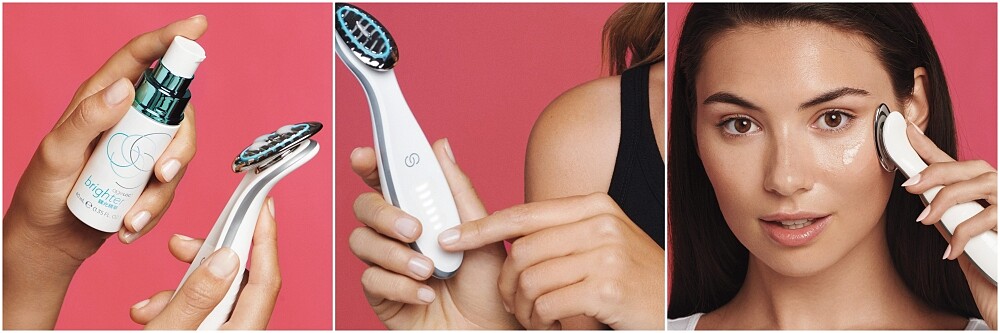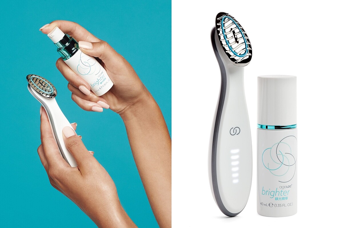 使用時,精華要搭配ageLOC brighter鎂光機一起使用。鎂光機本身走輕巧路線、重量不到70g,還是觸控設計。每次使用只要兩分鐘,就能幫助肌膚吸收精華,發揮更好的亮白、緊緻效果。