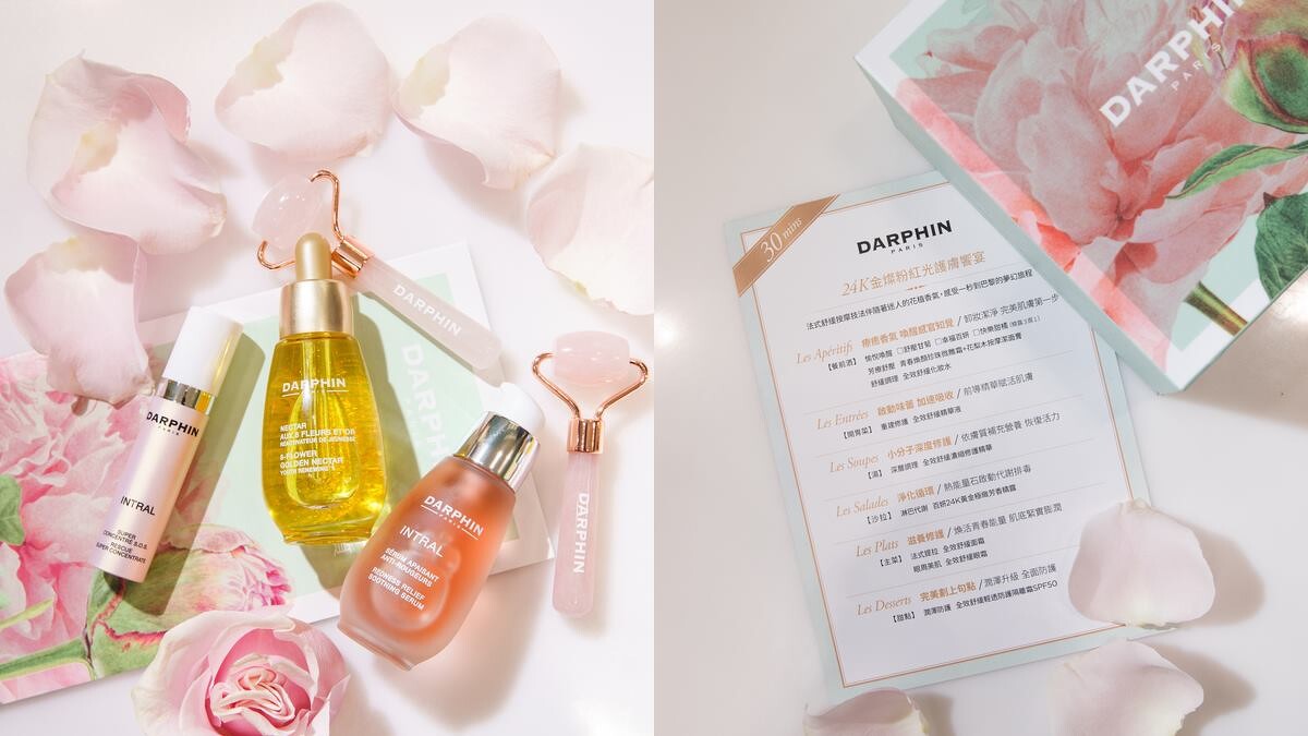 好比為妳開胃的全效舒緩精華液,在護膚會中登場,非常適合最近忽冷忽熱的天氣,今年特製的迷你粉紅水晶滾輪搭配24K黃金極緻芳香精露,達到深層循環,一如沙拉的輕盈健康,打造出小臉美肌,妳以為這源自法國餐廳的「24K 金燦粉紅光護膚饗宴」要價不斐,妳錯了,Darphin要送大家年末的禮物就是:只要繳交預約金NT500,就能體驗30分鐘為肌膚開燈!
