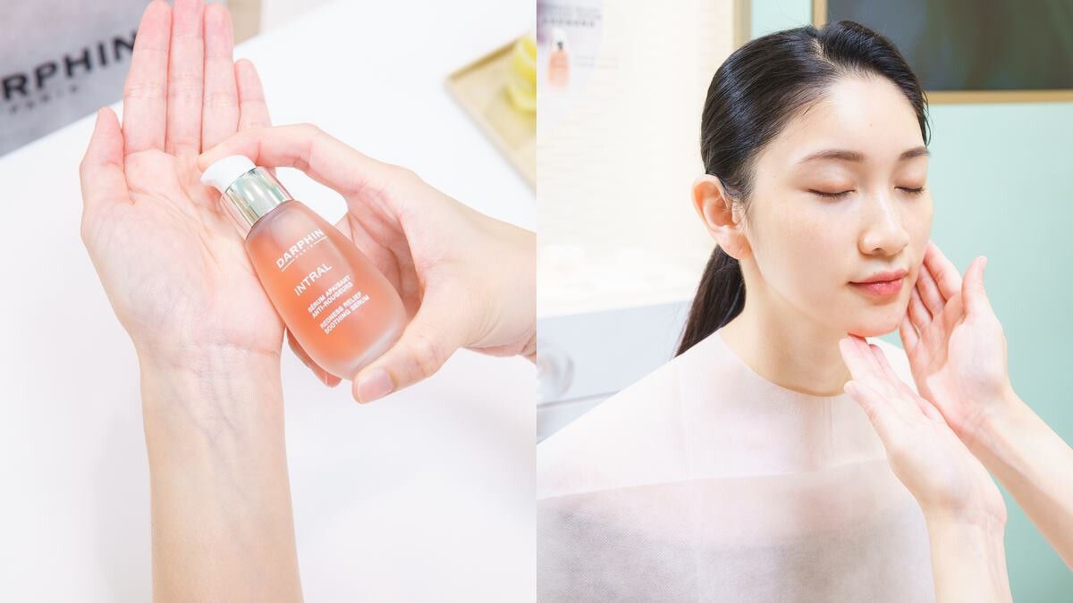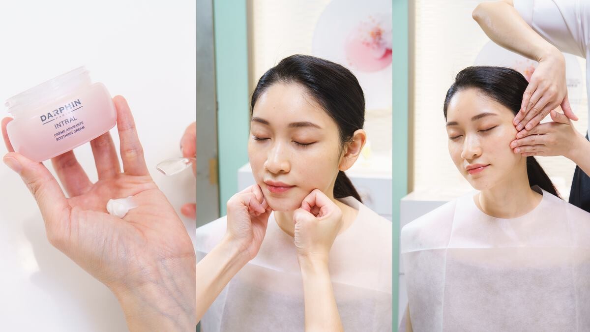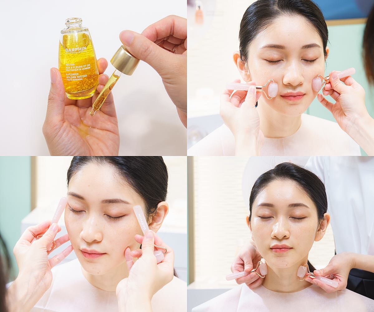 就像是來到法國米其林餐廳一樣,點餐前Waiter會詢問今天的餐前酒想要喝什麼,Darphin遵循這傳統先邀請妳透過嗅吸選擇喜愛的芳香精露,在療癒的植萃氣息環繞下,美容師會溫柔協助妳卸除彩妝,溫和的花梨木潔面膏蘊含珍貴的精油,一次就能卸妝、洗臉、按摩肌膚,同時使用全效舒緩化妝水舒緩調理肌膚,讓身心靈都先沉澱下來。