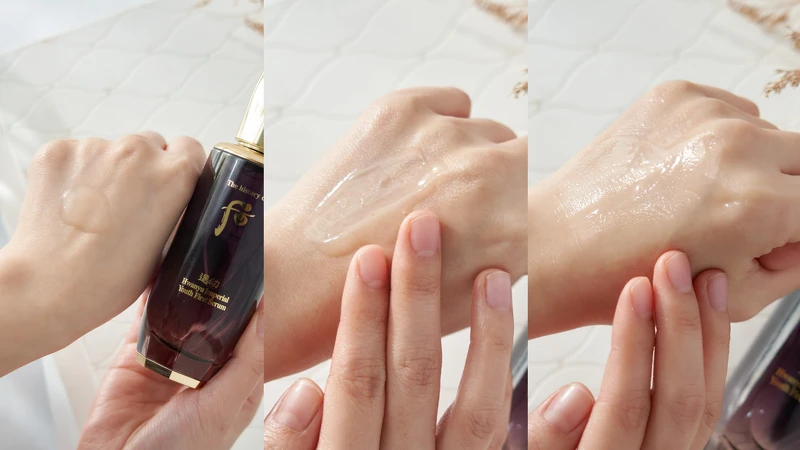 透明水感的質地,推開後清爽的爆水感,不給肌膚黏膩負擔,只留下滿滿的滋養,並於肌膚形成保水膜,展現柔嫩晶瑩的Q彈美肌。塗抹同時可以聞到淡雅的韓方香氣,每一次保養都如同皇室般的療癒儀式,絕對是前所未有的奢華感受。